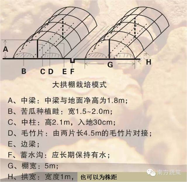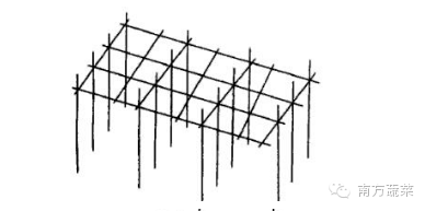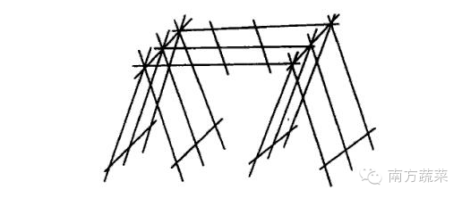 即在人字架上再搁置架材,将各畦人字架连成一片,为了操作方便可将人字架交叉点提高到140-150厘米处。这种搭架方式同时具有人字架和棚架的特点,茎蔓上架后水平分布,扩大了茎蔓生长空间,避免了一般人字架通风透光不良的缺点。