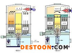 蓄热式热力焚化法(RTO,regenerativethermal oxidizers)是一种高效有机废气治理设备。其原理是在高温下将可燃废气氧化成对应的氧化物和水,从而净化废气,并回收废气分解时所释放出来的热量,废气分解效率达到99%以上,热回收效率达到95%以上。RTO主体结构由燃烧室、陶瓷填料床和切换阀等组成。根据客户实际需求,选择不同的热能回收方式和切换阀方式。
