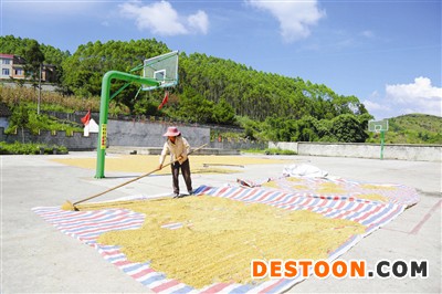 眼下,环江毛南族自治县的广大农民抢抓晴好天气,把抢收的稻谷晾晒在球场或自家楼顶上,以免发芽和霉变。